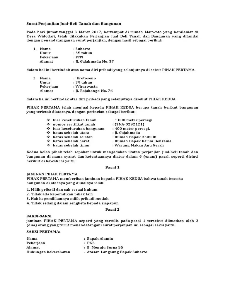 Surat Perjanjian Jual Beli Tanah Dan Bangunan / 3 Contoh Surat Perjanjian Jual Beli Tanah Beserta Manfaat Dan Cara Membuatnya. Di bawah ini adalah beberapa perjanjian dalam penjualan tanah: Apabila penjual sudah menikah, maka tanah dan bangunan akan menjadi harta bersama, sehingga penjualan tanah tersebut harus berdasarkan . Pihak pertama memberikan jaminan penuh bahwa tanah berikut bangunan yang terletak di atasnya yang dijualnya adalah: Bangunan yang terletak di atas tanah tersebut. Surat perjanjian jual beli tanah ini, dibuat oleh pihak penjual dan pembeli. Atau kepemilikan properti baik berupa tanah atau bangunan. Contoh surat perjanjian juali beli rumah, tanah, motor, mobil, sepeda, barang, download berupa doc/word sederhana, singkat, kredit bertahap, . Atas kepemilikan hak tanah dan bangunan rumah tersebut dalam hal .